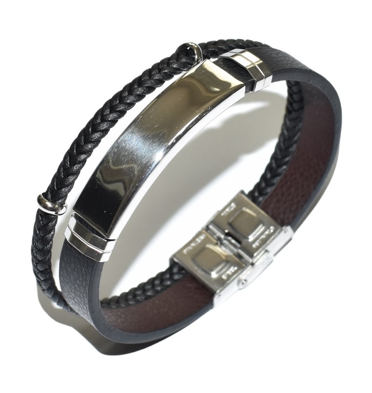 Pánský kožený náramek, vyrobený ze dvou kožených pásů. Jeden pás je proplétaný, druhý hladký. Na hladkém koženém pásu je efektní spona z kvalitní chirurgické oceli. Na tenčím pásku jsou navlečeny ocelové korálky. Zapínání náramku je provedeno pomocí spony.